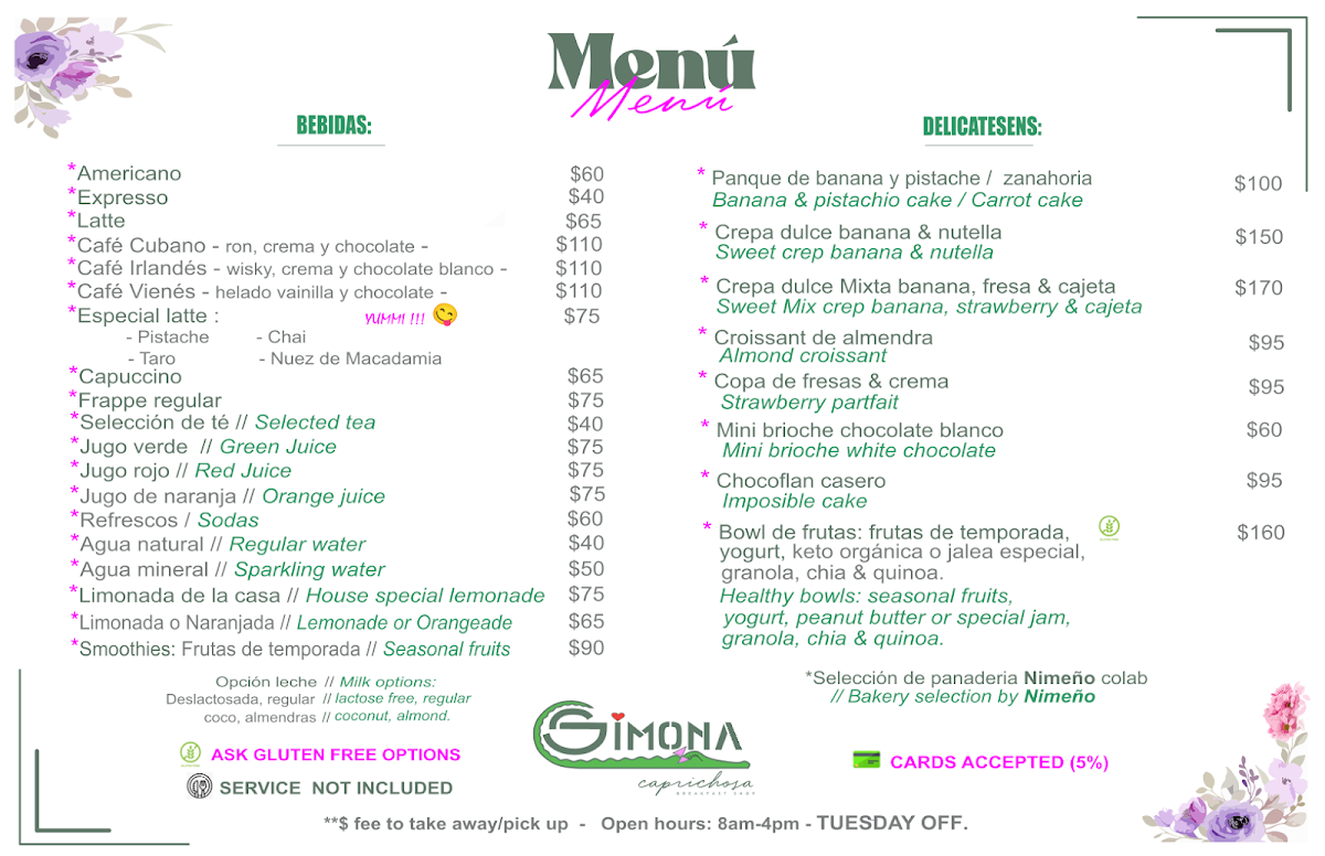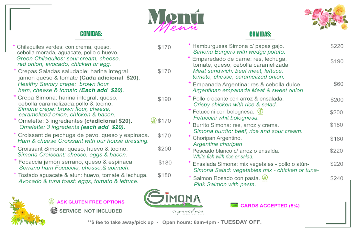 The menu at Simona caprichosa Breakfastshop offers a range of dishes primarily suited for breakfast and light lunch options. It includes a variety of food categories such as fresh fruit bowls made with premium seasonal fruits and cereals, traditional Mexican breakfast items like chilaquiles verdes served with special salsa, sour cream, avocado, cheese, and a choice of egg or chicken. Pasta options are also available, including a fetuccini bolognese with meat and a gluten-free alternative.